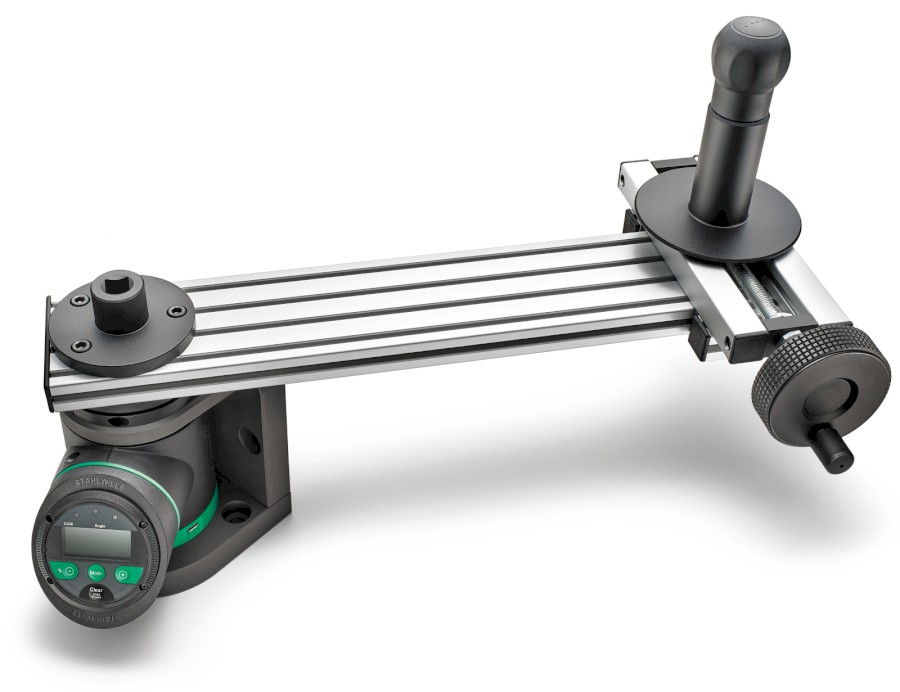 "Variabilní a flexibilní tester úhlu natočení díky vyměnitelným podpěrám pro momentové klíče s řízeným úhlem do 400 Nm